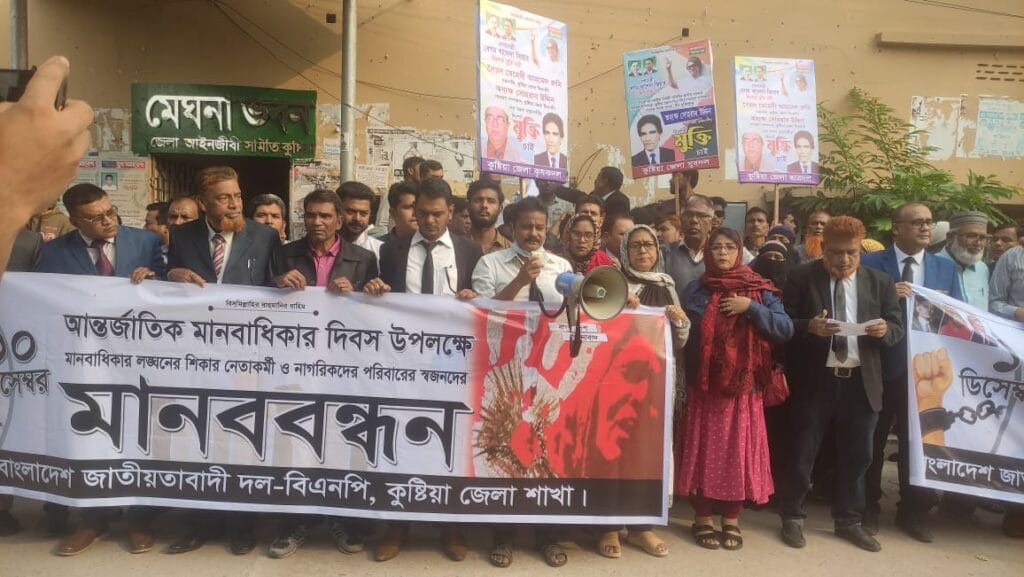 মানবাধিকার লঙ্ঘনের শিকার নেতাকর্মী ও নাগরিকদের পরিবারের স্বজনদের নিয়ে রবিবার বেলা আড়াইটার সময় কুষ্টিয়া কোর্ট চত্বরে উক্ত মানববন্ধন কর্মসূচি পালন করা হয়।
