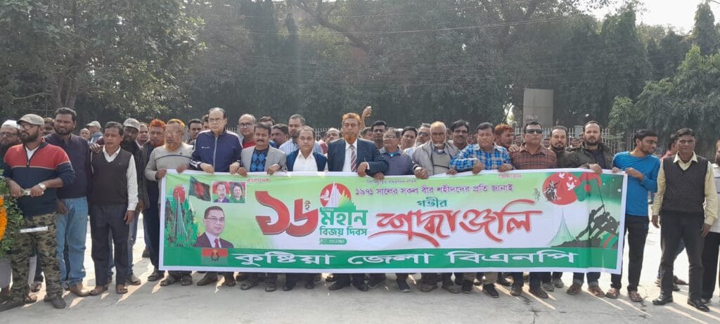 কুষ্টিয়া জেলা বিএনপি প্রতি বছরের ন্যায় এবারও যথাযোগ্য মর্যাদা ও গভীর শ্রদ্ধার সাথে মহান বিজয় দিবস উদযাপন করেছেন। এ উপলক্ষ্যে দলটির নেতাকর্মীরা বর্ণাঢ্য র্যালি ও কুষ্টিয়া জেলা কেন্দ্রীয় স্মৃতিসৌধে যথাযোগ্য মর্যাদায় পুষ্প স্তবক অর্পণ করেন। এসময় তাঁরা শহিদদের আত্মার মাগফিরাত কামনা করেন।