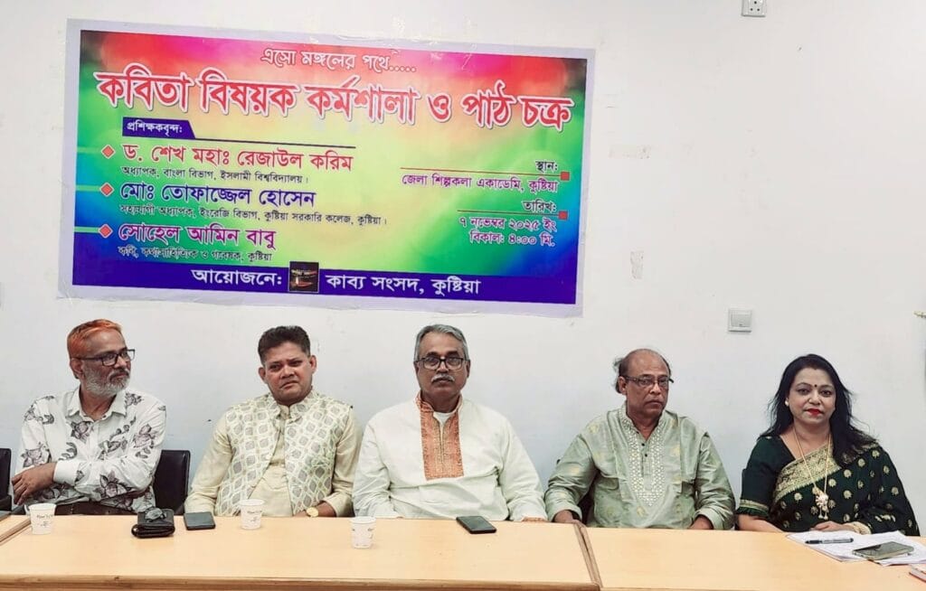 কুষ্টিয়া জেলা শিল্পকলা একাডেমির তৃতীয় তলায় কাব্য সংসদ কুষ্টিয়ার আয়োজনে “এসো মঙ্গলের পথে” আহ্বানে কবিতা বিষয়ক কর্মশালা ও পাঠচক্র অনুষ্ঠিত হয়েছে। গত শুক্রবার বিকেলে আয়োজিত এ কর্মশালায় কবিতা নিয়ে আলোচনা, পাঠ এবং আবৃত্তির মধ্য দিয়ে এক মনোমুগ্ধকর পরিবেশ সৃষ্টি হয়।