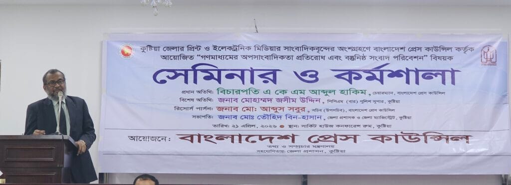 কুষ্টিয়া সার্কিট হাউসে বাংলাদেশ প্রেস কাউন্সিল-এর উদ্যোগে “গণমাধ্যমের অপসাংবাদিকতা প্রতিরোধ ও দায়িত্বশীল সংবাদ পরিবেশন” বিষয়ক দিনব্যাপী সেমিনার ও প্রশিক্ষণ কর্মশালা অনুষ্ঠিত হয়েছে।